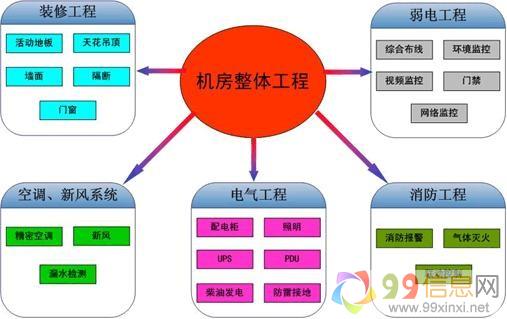 机房是各类信息的中枢,机房工程必须保zheng网络和计算机等设备能长期而可靠地运行的工作环境9~9~信~息~网。电子化基础设施的建设,很重要的一个环节是机房的建设。机房工程不仅集建筑、电qi、机电安装、装修装饰、网络构建等多个专业技术于一体,需要丰富的工程实施和管理经验来自www.99xinxi.net。机房设计与施工的优劣直接关系到机房内整个信息系统是否能稳定可靠地运行,是否能保zheng各类信息通讯畅通无阻。由于机房的环境必须满足计算机等各种微机电子设备和工作人员对温度、湿度、洁净度、电磁场强度、噪音、安全保安、防漏、电源质量、振动、防雷和接地等的要求9.9.x.i.n.x.i.n.e.t。